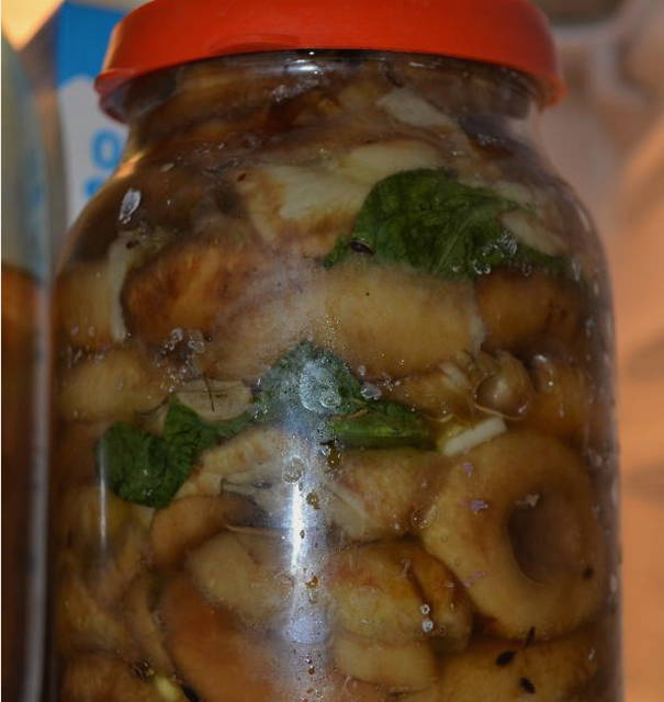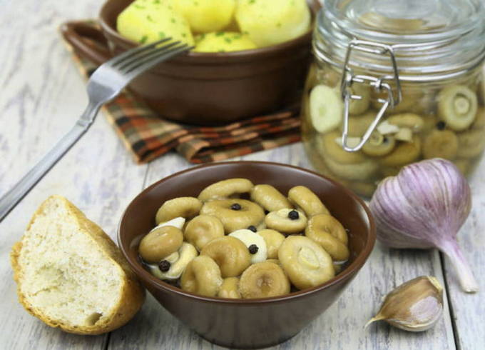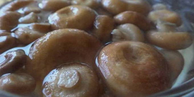 - Na twee weken zijn de paddenstoelen klaar om te eten. Voor eenvoudige opslag kunnen ze in schone steriele potten worden gevouwen, gevuld met pekel, worden afgesloten met deksels en worden bewaard in de koelkast.