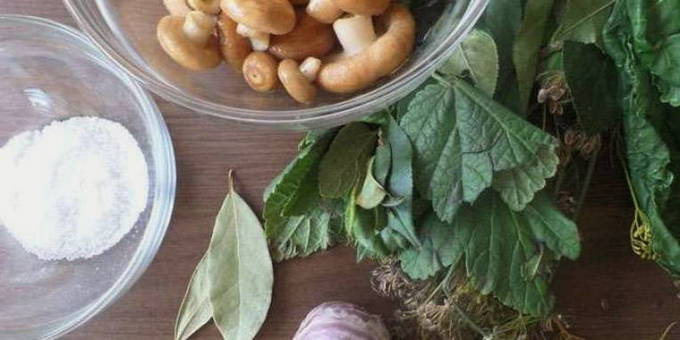 Het is moeilijk om dille in de samenstelling van verschillende augurken te overschatten - het is aromatisch, geurig, het zal elke bereiding smakelijker maken. Champignons zijn geen uitzondering. We gebruiken "paraplu's" om de golven te zouten. We passen hun hoeveelheid aan naar onze eigen smaak - hoe meer, hoe rijker het aroma. Vergeet mierikswortelbladeren niet, omdat ze werken als een ontsmettingsmiddel en conserveermiddel gestoomd met zout.
