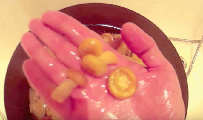 - We zetten onderdrukking op de paddenstoelen onder het groen. Het is handig om een gewoon blikje water te gebruiken. Na een paar dagen zullen de golven een merkbare hoeveelheid sap afgeven, waarna we het werkstuk samen met onderdrukking in de koelkast verwijderen en een maand laten uitzouten.