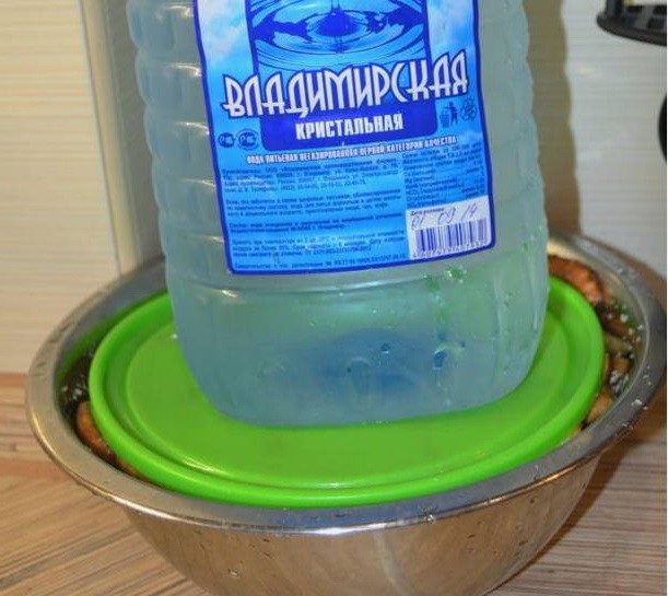 - We plaatsen er een plat bord of een deksel met een kleinere diameter op en plaatsen de lading. Het is handig om een waterfles te gebruiken. We laten vijf dagen onder druk pekelen. Gedurende deze tijd worden de paddenstoelen bedekt met pekel.