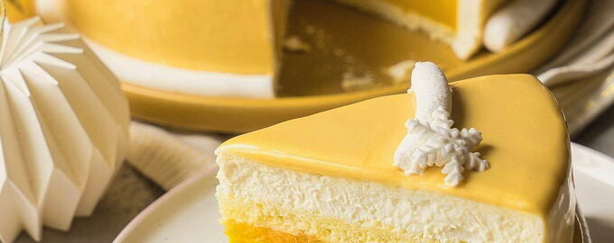 Moussecake met spiegelglazuur thuis Moussecake heeft een speciale, luchtig-poreuze consistentie en lichte textuur van zijn lagen.