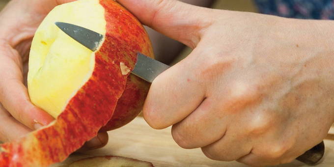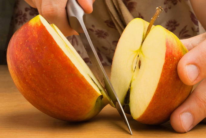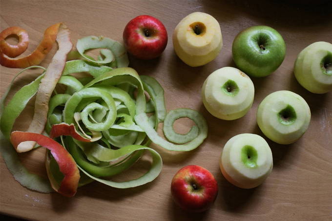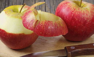 - We wassen de appels, vegen ze af en snijden de schil af. Als er een lichte rotting op het oppervlak van de vrucht of andere schade is, verwijderen we deze ook.