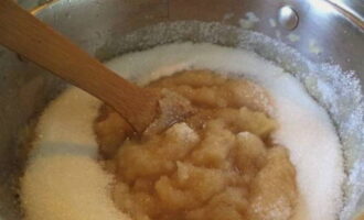 De appels zijn zacht geworden. Giet er suiker in, meng en kook onder een gesloten deksel gedurende 15 minuten. Vergeet tijdens het stoven niet om de appelmassa te roeren.