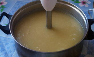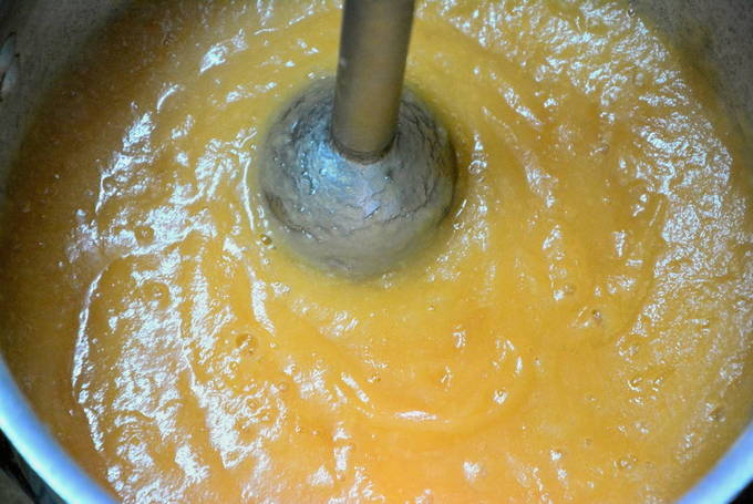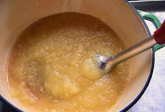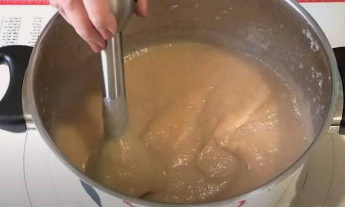 - Haal de pan van het fornuis. We zetten de apparatuur uit. Maal de appelmassa met een staafmixer. Zet de container met appelmoes terug op de brander en laat het mengsel vijf minuten sudderen.