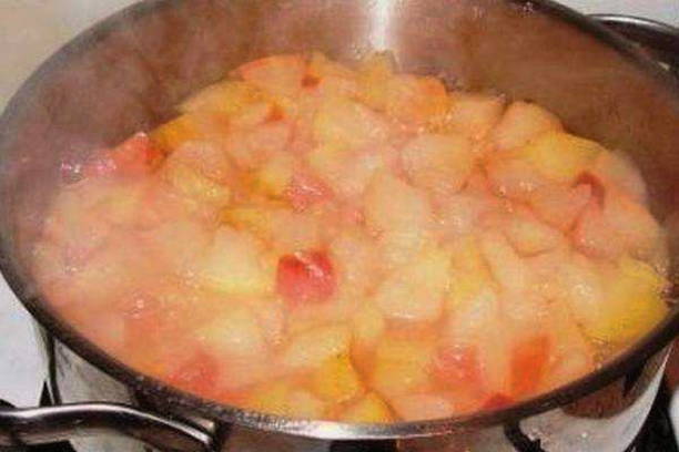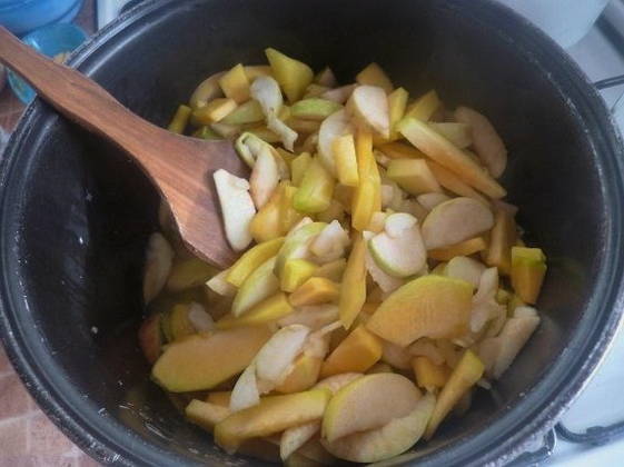 - We nemen een pan met een dikke bodem. Giet er stukjes appel in en vul ze met water. We zetten de container op het fornuis en laten 25 minuten op laag vuur sudderen onder een gesloten deksel.