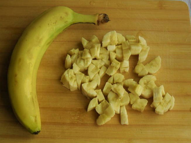 - We wassen de banaan en schillen hem. Snijd in kleine blokjes. Giet de banaan bij de gekookte appels en voeg twee eetlepels suiker toe.