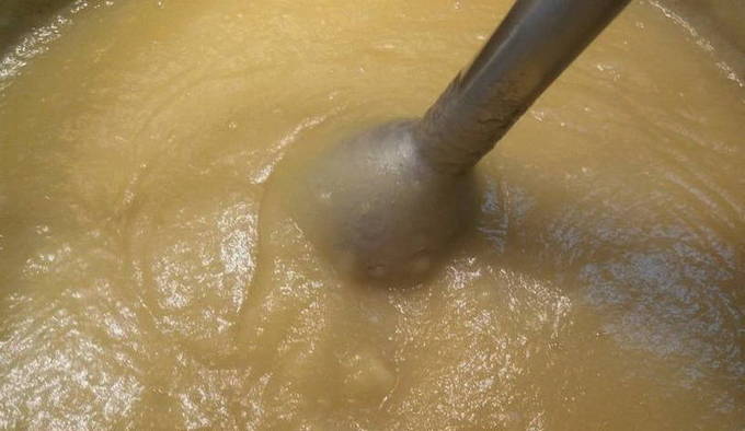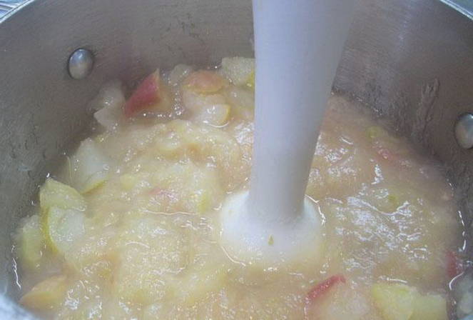 - Haal de pan van het fornuis en schakel de techniek uit. Doop een staafmixer in de appelmassa en klop deze tot puree.