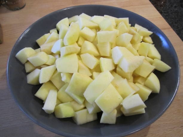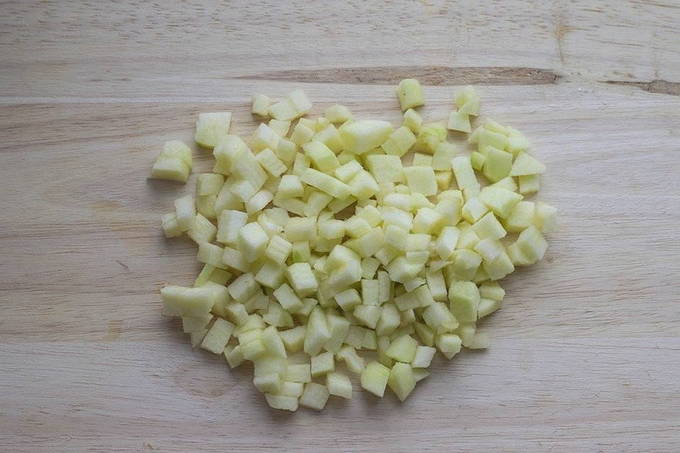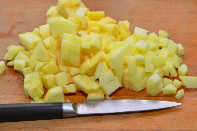 - Nu nemen we elke appel en snijden deze in twee delen. We verwijderen "staarten", alle defecten en zaden. We laten alleen het vruchtvlees en de schil over. Snijd elke helft in kleine blokjes.
