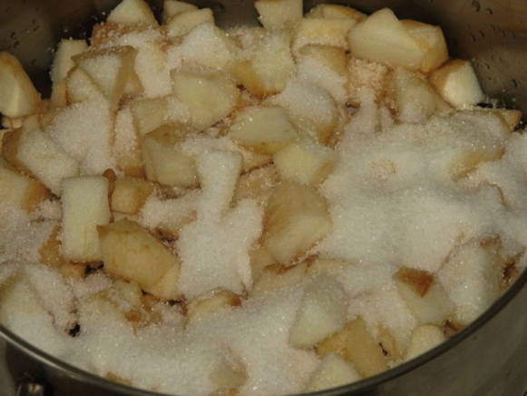 - Doe de appels in een pan en bedek ze met suiker. Laat de appels een nacht staan (6-8 uur). Gedurende deze tijd zullen de vruchten sap beginnen.