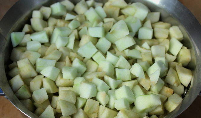 - We wassen de appels in stromend water. We vegen ze af met een theedoek en snijden ze in tweeën. Daarna verwijderen we de kern en verschillende beschadigingen - rot en mee-eters. We ontdoen ons van de "staarten". Snijd de appels in kleine blokjes en doe ze in een pan.
