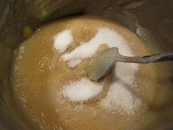 - De massa zal geleidelijk zachter worden. Voeg op het moment van koken suiker en boter toe. Laat de appelmoes 10 minuten sudderen.