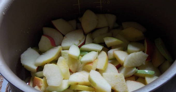 - Doe de appelblokjes in de multicookerkom. Vul ze met een glas water en dek af met een deksel. Kook de appels tot ze zacht zijn gedurende 60 minuten in de sudderstand.