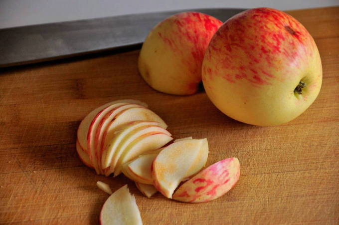 - Was eerst de appels. Veeg ze droog met een handdoek en snijd ze in twee. We verwijderen de "staarten", kern en andere gebreken van het fruit. Snijd de appels in grote stukken of partjes.