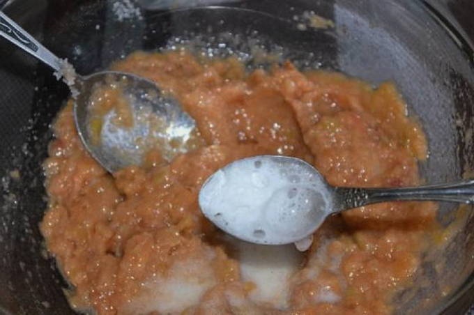 - Spoel de appels grondig af en droog ze af met een handdoek. Snijd het fruit in 4 stukken en verwijder de schil. We verwijderen rot en mee-eters, verwijderen de kern. Maal de appelpartjes in kleine stukjes.
