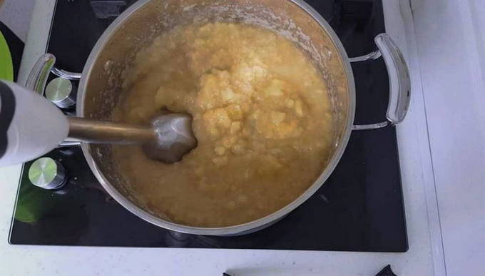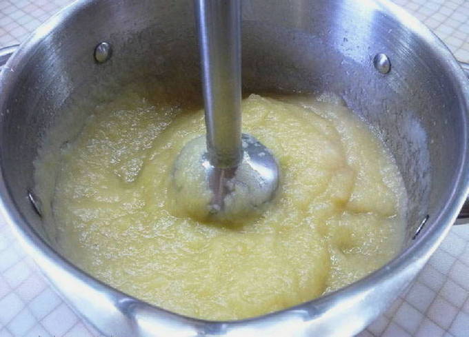 - Zet na de toegestane tijd het vuur uit en zet de pan met het appelmengsel opzij.Neem een staafmixer en maal de massa tot een gladde puree.