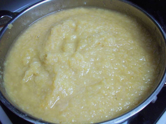 - Vervolgens sturen we appel-perensap naar het mengsel. We zetten het fornuis aan en zetten de pan op de brander. Breng het mengsel aan de kook. Roer daarbij de massa.