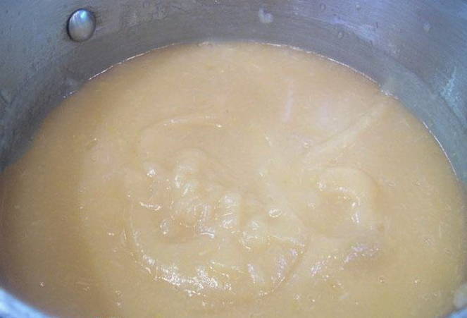 - Als de appelmassa gekookt is, haal je het vuur uit de pan en zet je de pan op de branders. Maal het mengsel met een staafmixer. Breng weer aan de kook onder een gesloten deksel en giet de puree in de potten. We rollen de containers op met deksels. Draai om en wikkel tot het volledig is afgekoeld.