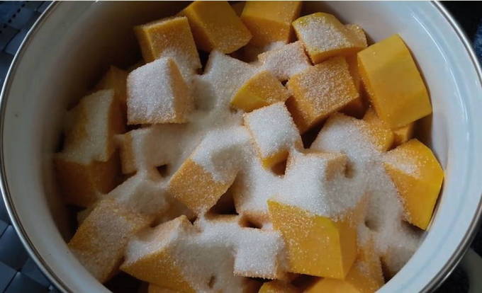 - Giet de pompoen in een aparte diepe container. Vervolgens sturen we een glas suiker en mengen we de inhoud van de kom. Het gesneden fruit laten we even staan, zodat het sap op gang komt.