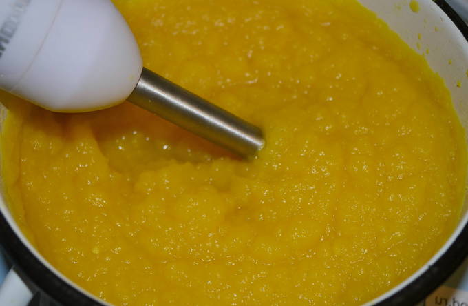 - Haal na een half uur de pan van het fornuis en zet de apparatuur uit. Maal de vruchten tot puree door de staafmixer erin te laten zakken.