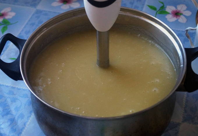- Haal de pan van het fornuis. We zetten de apparatuur uit. Maal de appelmassa met een staafmixer. Zet de container met appelmoes terug op de brander en laat het mengsel vijf minuten sudderen.