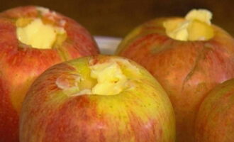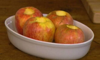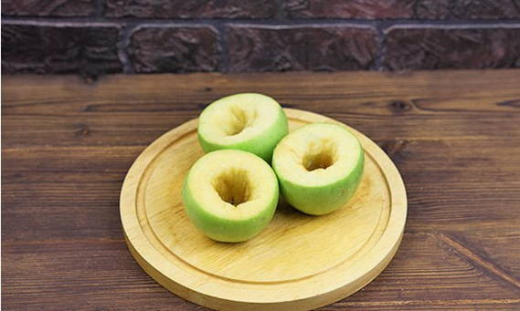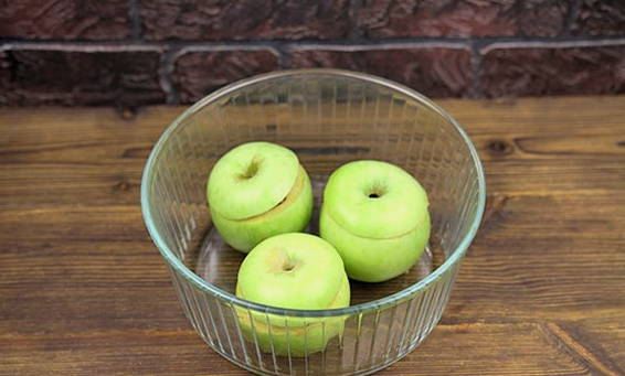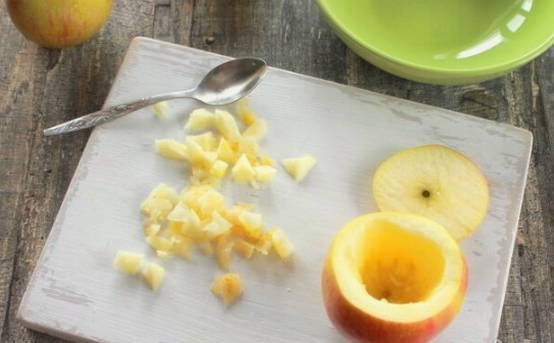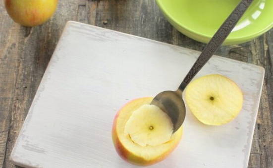 - We wassen de appels, snijden voorzichtig de bovenkant af en gebruiken een lepel om het klokhuis eruit te snijden.
