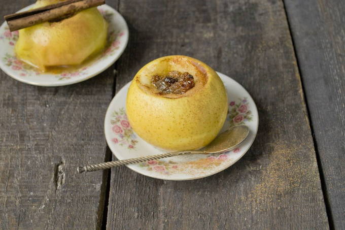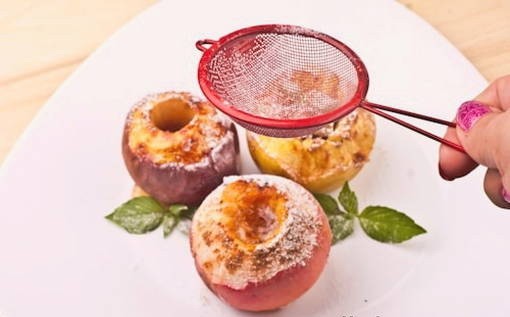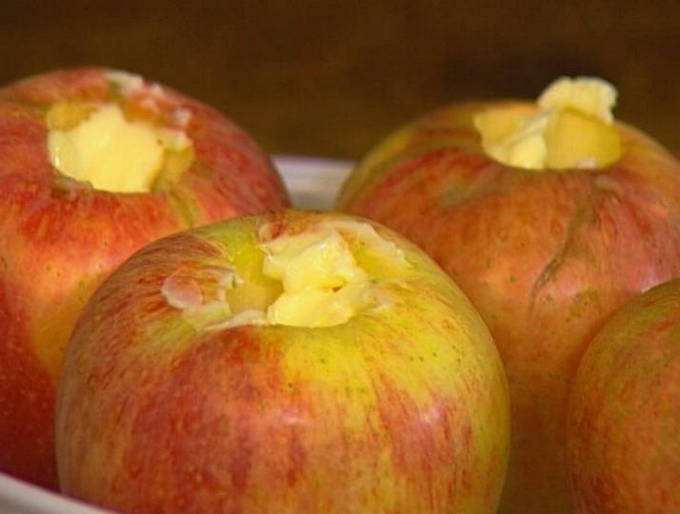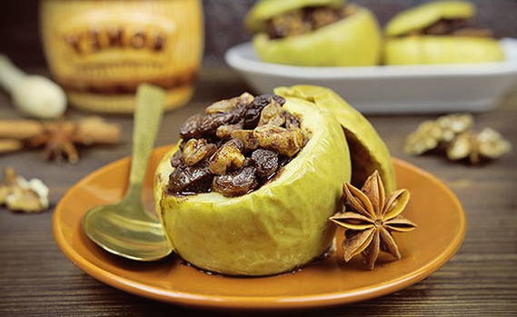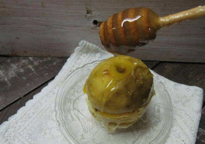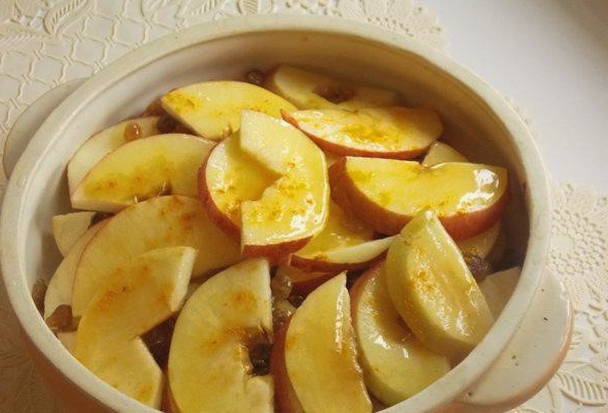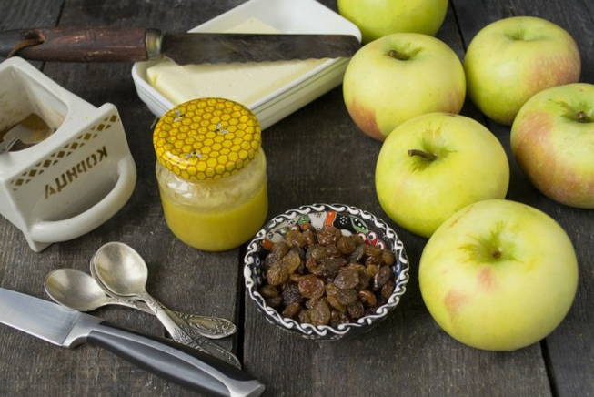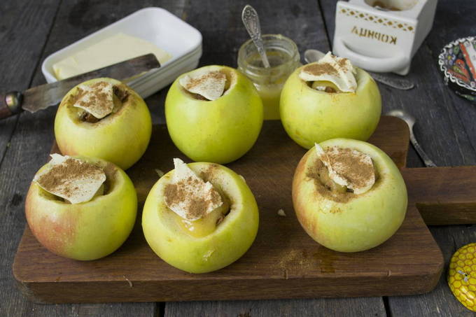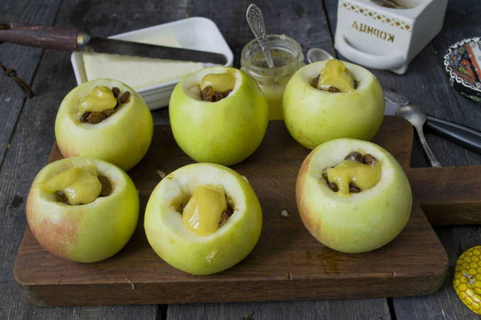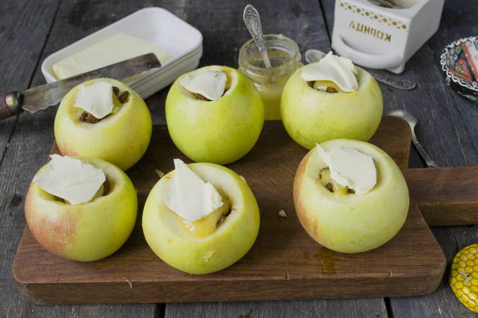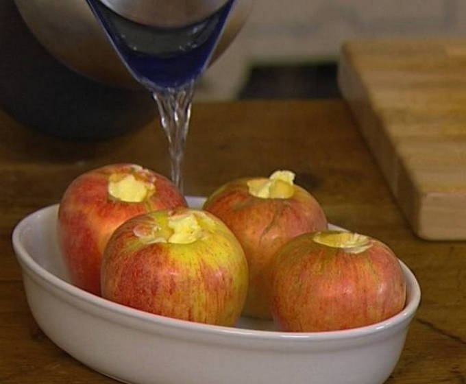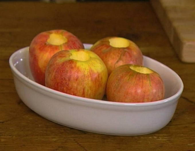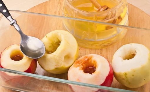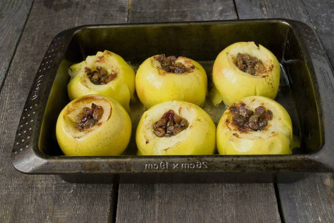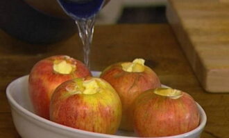 - Leg het voorbereide fruit in een ovenschaal. Giet vloeibare honing in de gemaakte gaten.