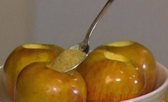 Giet na een tijdje suiker in de groeven. We koken de traktatie nog eens 15 minuten. Zoet gebakken appels zijn klaar. Laat het product iets afkoelen en serveer!