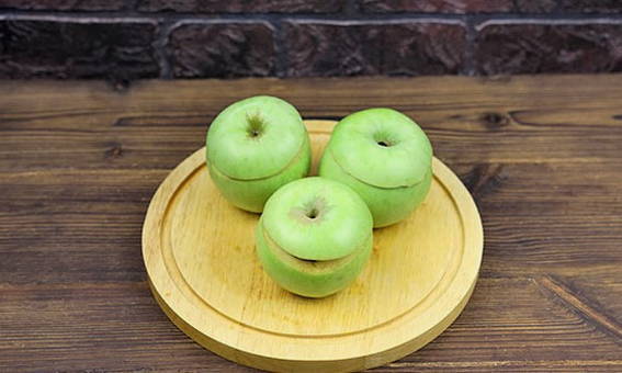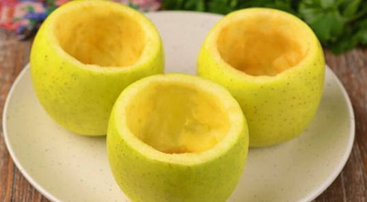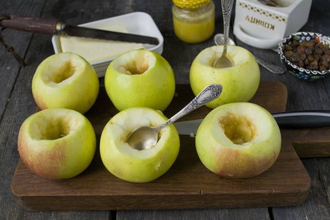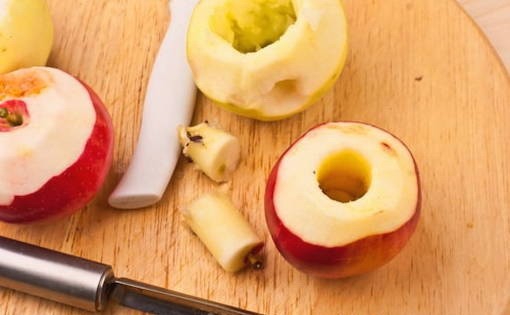 - Snijd voorzichtig de kern en een deel van het vruchtvlees eruit. Het is belangrijk om de appels zelf niet te beschadigen.