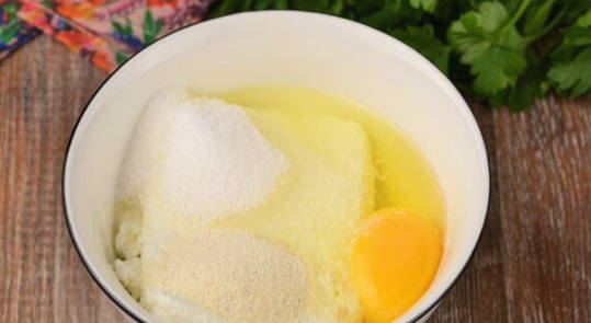 - Doe de kwark, het kippenei, de suiker en wat griesmeel in een diepe kom.