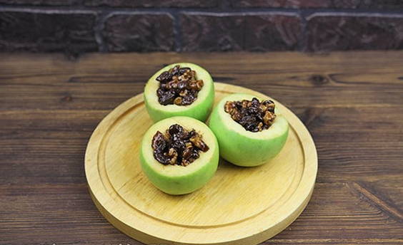 - Kneed de noten met rozijnen en zachte boter. Plaats de blanco in het midden van de appelhelften.