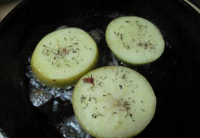 - We wassen de appel en snijden hem in drie delen. Bak elk in olijfolie en Provençaalse kruiden.