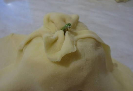 - We wikkelen het fruit in het deeg. We laten alleen de stengel over.