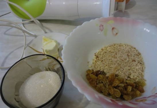 - Strooi wat rozijnen over het hoofdingrediënt. We laten het van tevoren in koud water weken.