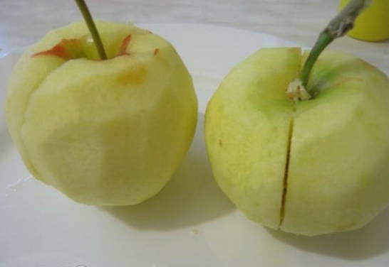 We wassen de appels, snijden voorzichtig de steel en het klokhuis eruit met een scherp mes. Het is belangrijk om het fruit niet volledig te snijden.