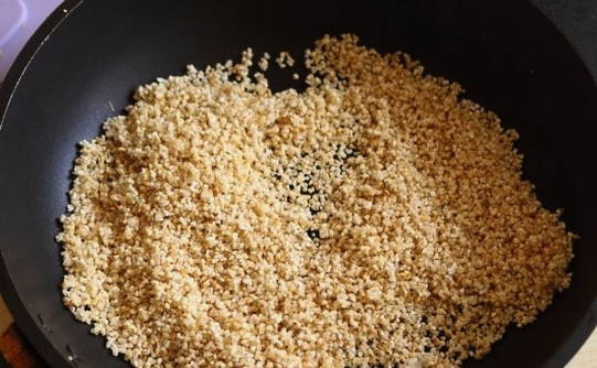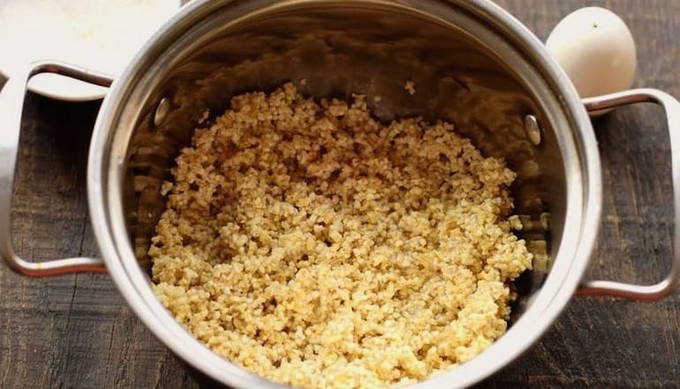 Daarna brengen we het bereide product over in een hete koekenpan. Opwarmen en drogen voor een paar minuten. Daarbij roeren we actief de inhoud.