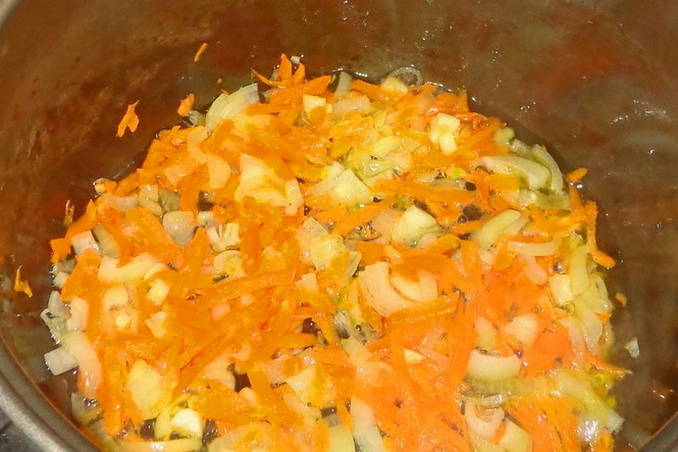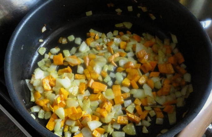 - Snipper uien, wortelen en knoflookteentjes. Bak groenten tot ze zacht zijn in plantaardige olie in een pan met een dikke bodem.