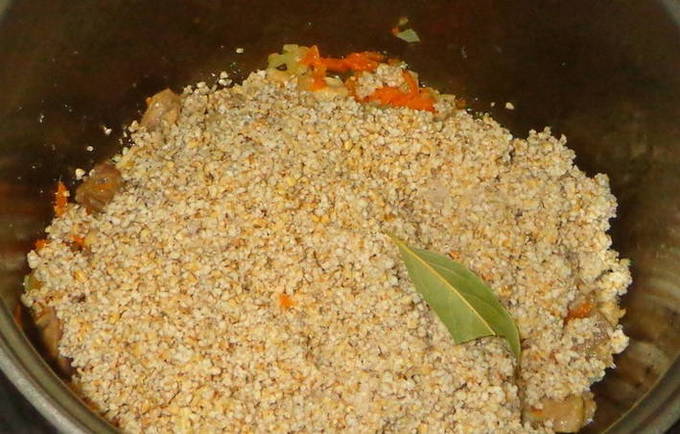 - Doe vervolgens in een pan, voorgewassen gerstgrutten onder water. Zout voedsel en voeg kruiden naar smaak toe.