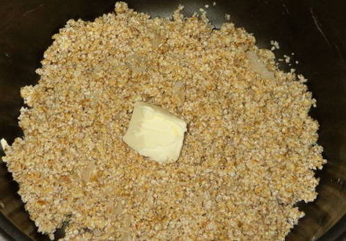 - Voeg aan het einde van het proces een stukje boter toe aan de schaal en laat deze nog 10 minuten onder het deksel staan.