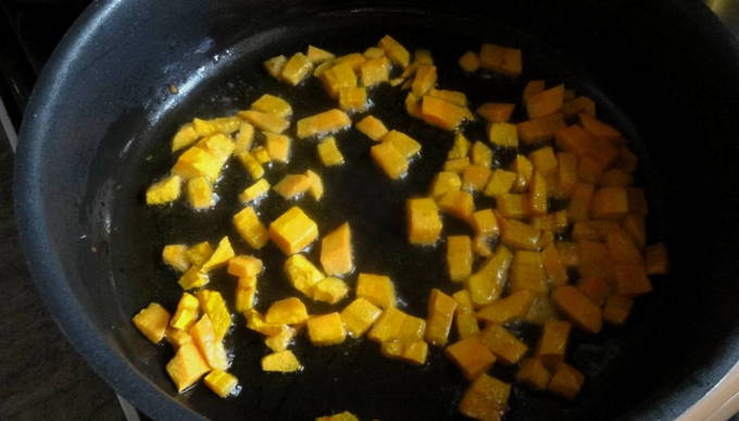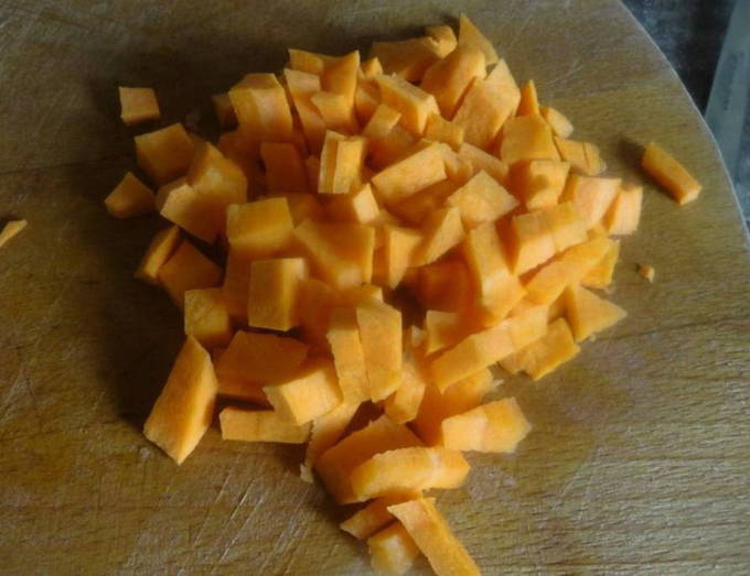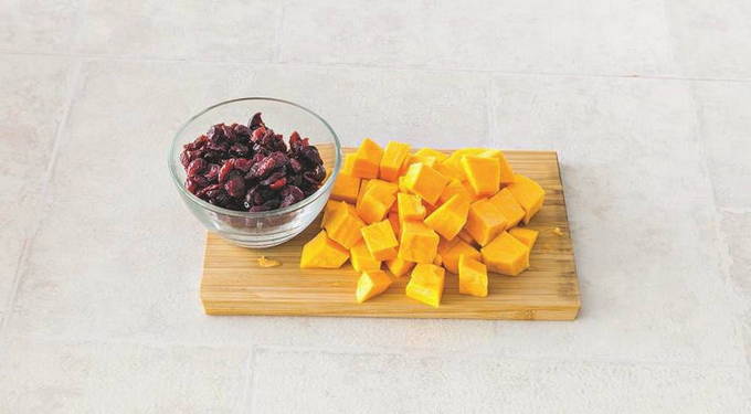- Laten we de benodigde hoeveelheid gedroogde veenbessen meten. Schil en ontpit de pompoen en snijd het fruit in kleine blokjes.