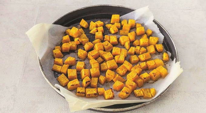 - Leg de pompoenstukjes op een bakplaat met bakpapier. We bakken het product ongeveer 15 minuten op een temperatuur van 220 graden.