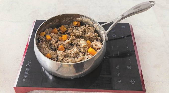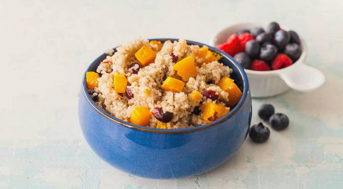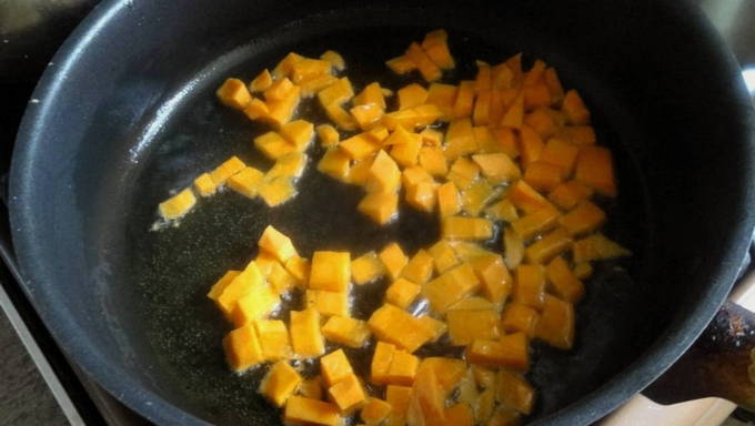 - We sturen veenbessen en pompoen naar de afgewerkte granen. Ook doen we hier suiker, kaneel en een stukje plantaardige olie. Roer het gerecht om en laat 15 minuten onder het deksel staan.