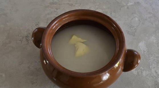 - Giet vervolgens melk in en doe boter. We zetten het werkstuk 1 uur in een oven die is voorverwarmd tot 200 graden.