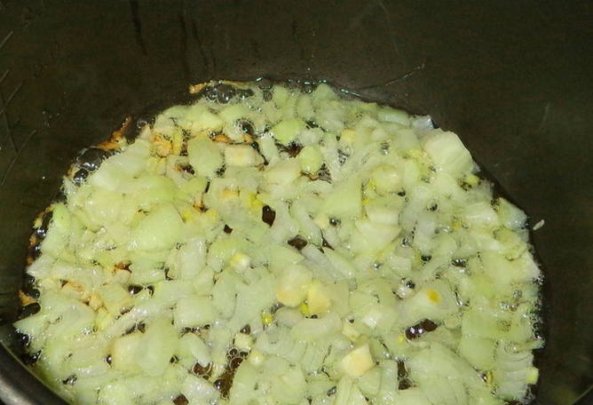 - Daarna bakken we het in olie in een multicooker-kom. Koken tot blozen en helder aroma.