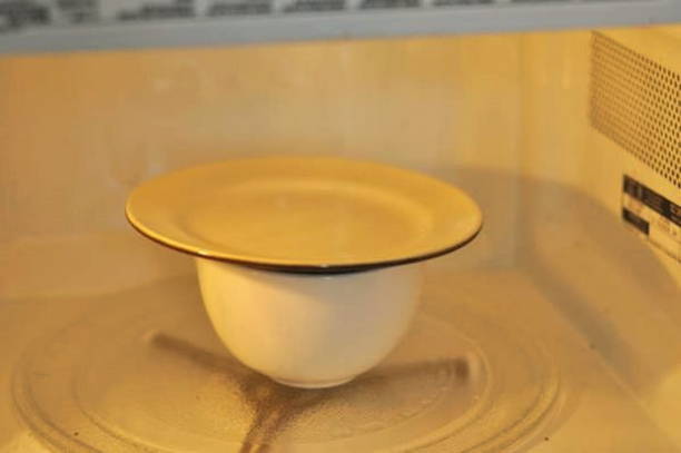 Bedek de mok met een schotel en plaats in de magnetron. Stel het magnetronvermogen in op 400-500 watt.