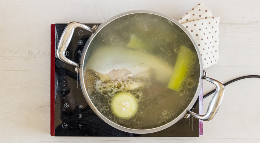 - We filteren de bouillon door een zeef of kaasdoek en plaatsen er een schone tong, poten en vleugels van een kalkoen in. Voeg de teentjes knoflook, uien, kruiden toe en kook nog 2,5 uur, tot de bouillon dik en plakkerig wordt.