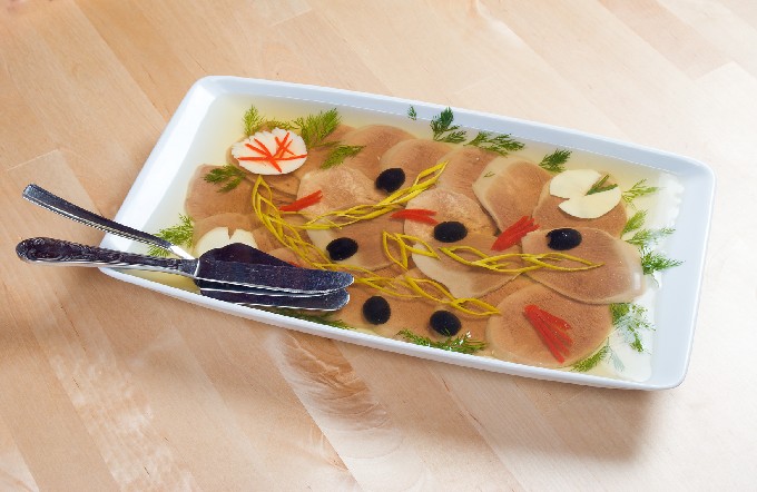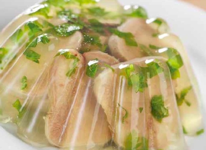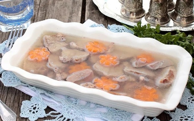 Het klassieke recept voor aspic. Wij raden aan om zo'n gerecht te serveren met mierikswortel of mosterd. Gekookte aardappelen of aardappelpuree zijn zeer geschikt voor garnering.