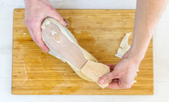 - Als de bereiding klaar is, moet de tong 2 minuten in een kom met ijswater worden ondergedompeld, waarna het verwijderen van de schil een eenvoudig proces is. Schil en zet opzij om af te koelen.