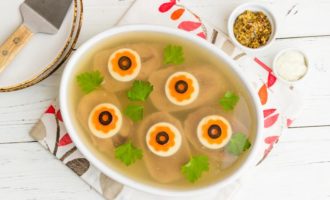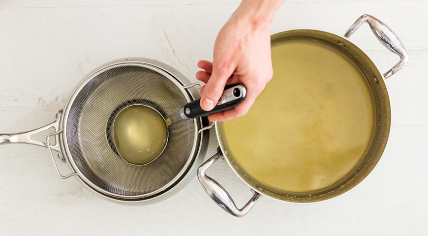 We nemen een zeef, doen deze in een kom en filteren de bouillon. Meng in een aparte kom de eiwitten met een garde met een deel van de bouillon en giet ze vervolgens in een pan met de bouillon, roer goed en laat 15 minuten op laag vuur staan, tot het eiwit stolt. Zeef de bouillon opnieuw, nu wordt het veel transparanter. Zet het gerecht opzij om af te koelen.