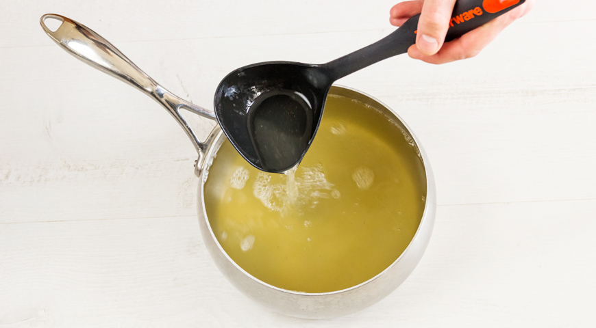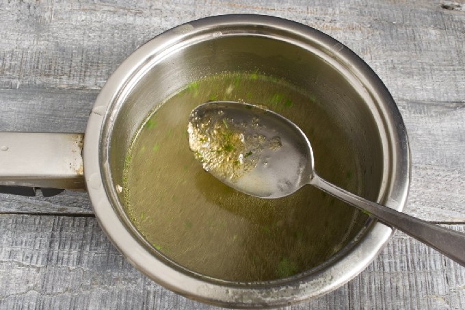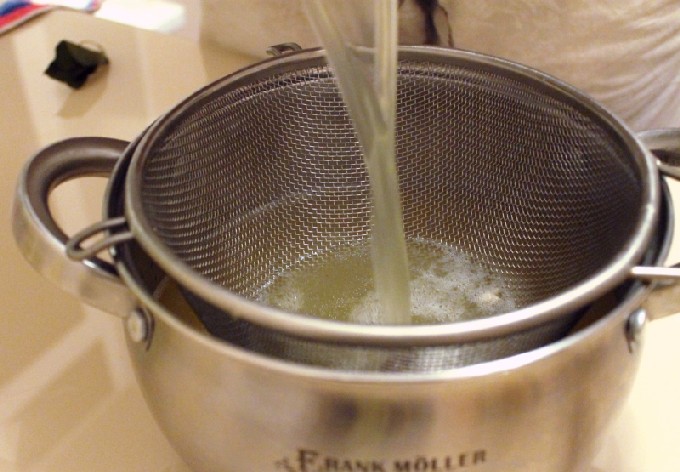- Zeef de bouillon met behulp van een zeef of kaasdoek die in meerdere lagen is gevouwen en meng met gelatine, die eerder in water is gedrenkt. Zet de bouillon op het vuur, laat het niet koken, en roer, wacht tot de kristallen zijn opgelost. Voeg de geperste knoflook toe met een pers. Zeef de bouillon opnieuw of gebruik een schuimspaan om de resterende knoflook uit de bouillon te halen.