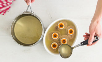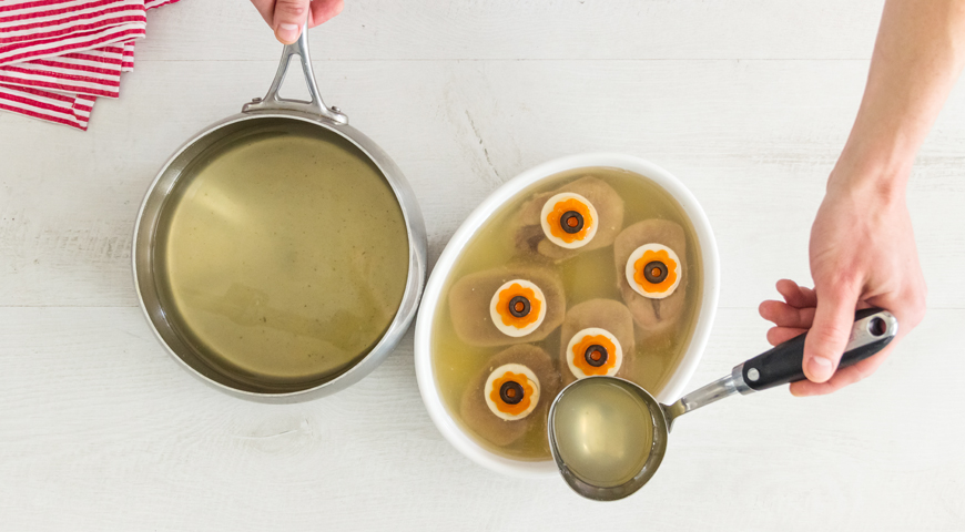 - Vul de vorm langzaam met bouillon en zet hem 3 uur op een koude plaats tot hij volledig stolt.